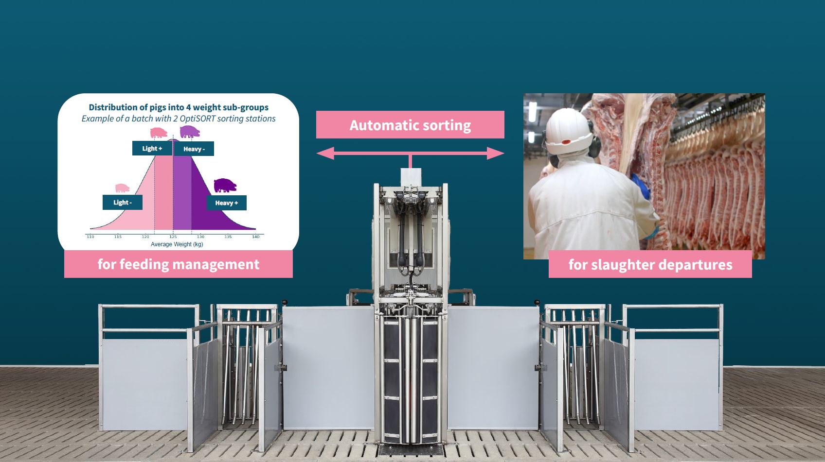 At the heart of the system, the OptiSORT station provides automated optical weighing and sorts the pigs without any human intervention. It automatically weighs and directs the animals to adjust their feed according to their weight and to select them at the optimal time for their departure to the slaughterhouse.