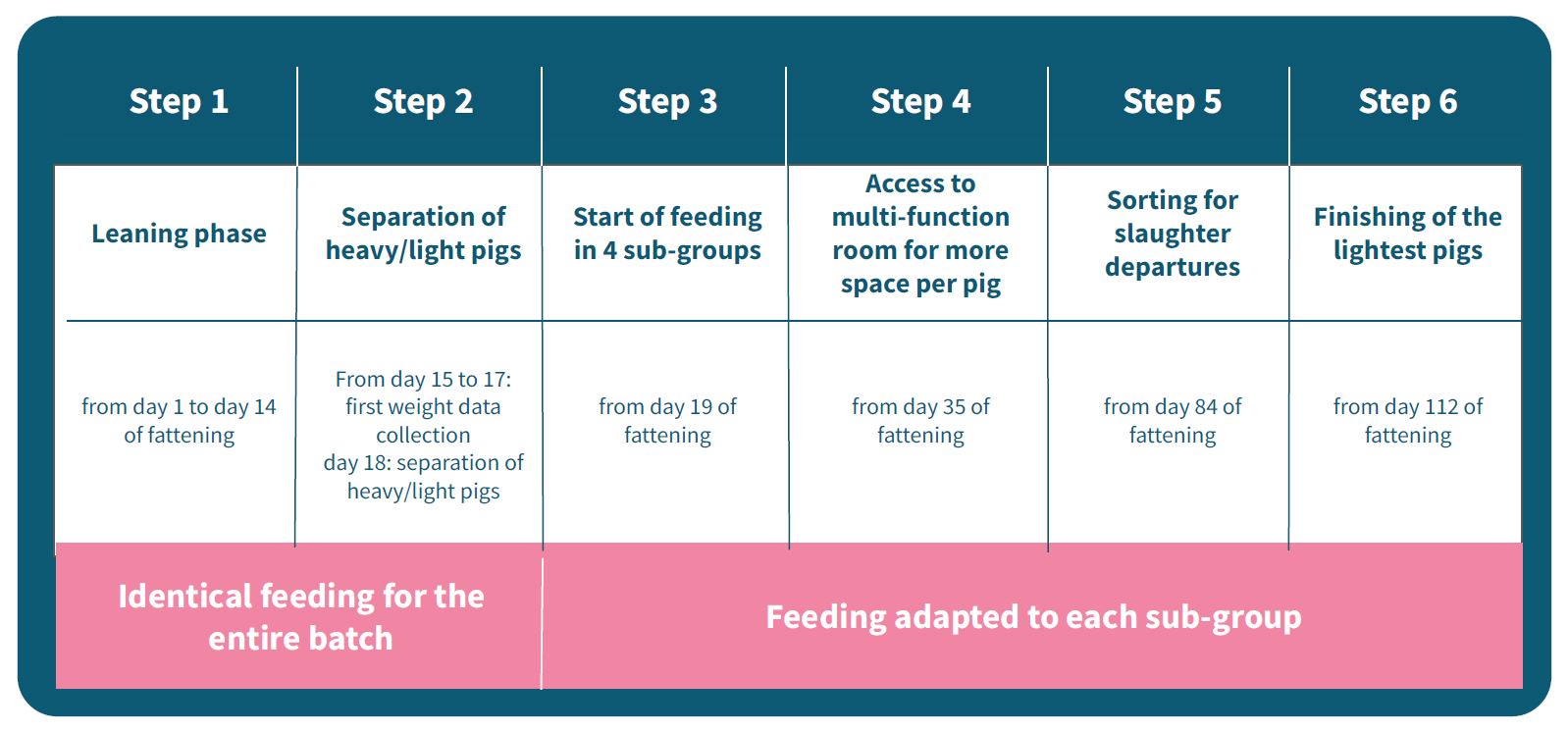 This 6-step management system allows for continuous adaptation of animal management and feeding. Upon arrival, the pigs learn to use the station, then are progressively divided into homogeneous subgroups according to their weight.